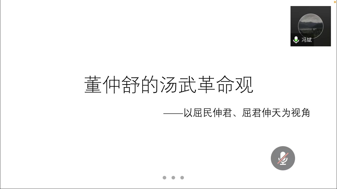 论坛伊始,冯斌对汤武革命的含义及如何看待汤武革命进行介绍,揭示了汤武革命的实质,即以暴力手段推翻无道昏君是否正当,进一步说是尊君与革命之间的张力。随后,他分三部分阐释了董仲舒如何解决这一冲突,一是董仲舒对先秦汤武革命观的继承,二是屈民伸君——尊君的意义,三是屈君伸天——革命的依据。最后,冯斌对主讲内容进行总结,他指出董仲舒通过屈民伸君、屈君伸天的主张调和了尊君与革命的关系,其汤武革命观贯彻了孔孟以来的民本路线,并阐发了尊君的合理意义,说明了革命的形上依据以及现实困难,实现了两者的有机结合。