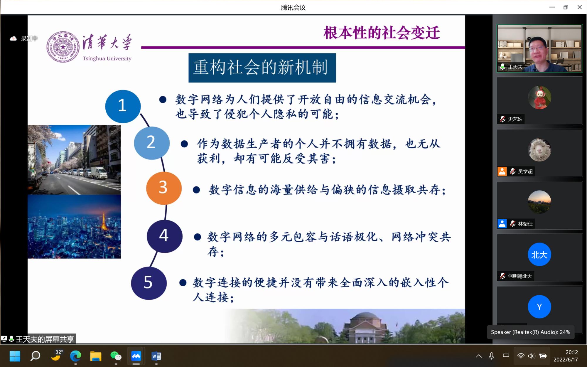 王天夫从社会链接的改变、数字社会根本性的社会变迁、数字社会研究三方面讲解了数字社会带来的社会变迁、社会知识体系面临的数字化挑战,以及如何敏锐地抓住数字时代的发展脉搏,迎接社会科学发展的机遇。