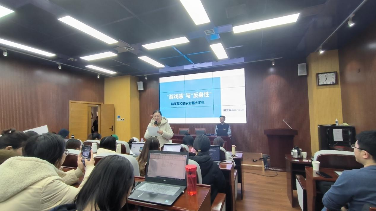 在随后的讨论和提问环节,李淼教授和陈洁修老师对谢爱磊教授的演讲给予了高度评价。李淼教授表示,谢爱磊教授的演讲不仅提供了深入的学术见解,而且对提升教育实践具有重要的启示意义。陈洁修老师也对谢爱磊教授的研究成果表示赞赏,并提出了对未来研究方向的期待。学生们积极参与提问,问题包括如何界定“农村籍大学生”、如何扩展“小镇做题家”概念的内涵和外延、如何更好地理解这些学生的心理状态,以及“反身性”思考的意义和价值等。谢爱磊教授对学生们的问题进行了详细解答,他的回答不仅涵盖了学术理论的深度,还体现了对学生实际问题的深刻关注。他鼓励学生们深入理解农村籍大学生的独特经历,以及他们在精英教育环境中面临的挑战和机遇。最后,讲座在学生和教师们的热烈掌声中圆满结束。