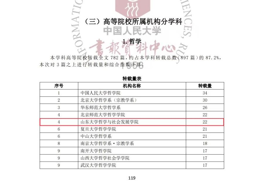 山东大学哲学学科在2023年度复印报刊资料转载指数排名中名列前茅