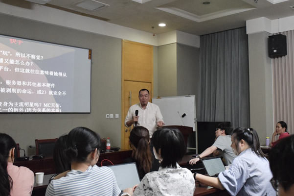 邓国基老师首先对“快手”这一媒体平台的性质、规模、功能等做出了系统的介绍,并分析出“快手”受众群体具有用户年轻、底层工作或无业、低收入等特征。接着,邓老师通过例子提出观点,即直播是高度被剥削的劳动。他认为,社交媒体用户生产两种商品:注意力和大数据。与一般的商品受到报酬递减律影响不同,网络讯息的生产受到报酬增加律的影响。由此,邓老师引用“电子家庭主妇”这一概念,意指网络主播出卖了可转让的大数据和不可转让的情感。邓老师通过呈现对19名网络主播和20名观众的研究,解析了主播与平台各自的盈利方式,指出中国的生产转向非物质劳动,特别是“生产或操作情感”的情感劳动;而快手等平台展现了“社会工厂”的概念。最后,邓老师总结到,大众化的“快手”平台体现了新自由主义的特征。主播在得到经济效益的同时,也遭受着平台的剥削。