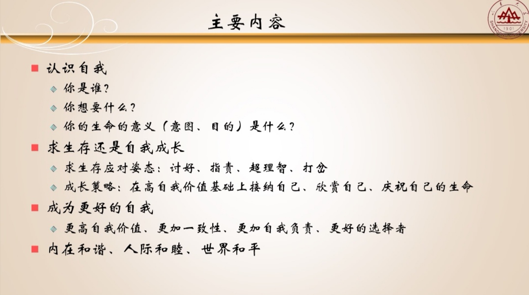 首先,程胜利教授简要介绍了萨提亚的冰山理论,接下来,在关于“是追求生存还是追求自我成长”的分享中,他认为,我们是生活在情境和他人中的人,应该学会与环境与和谐相处。根据萨提亚的观点,求生存的应对姿态分为讨好型,指责型,超理智型和打岔型。我们应追求自我,他人与情境的和谐,实现在压力之下的一致性回应,在这种情境下,我们才能真正感受到自我价值,跨越这四种求生存的姿态获得自我成长。