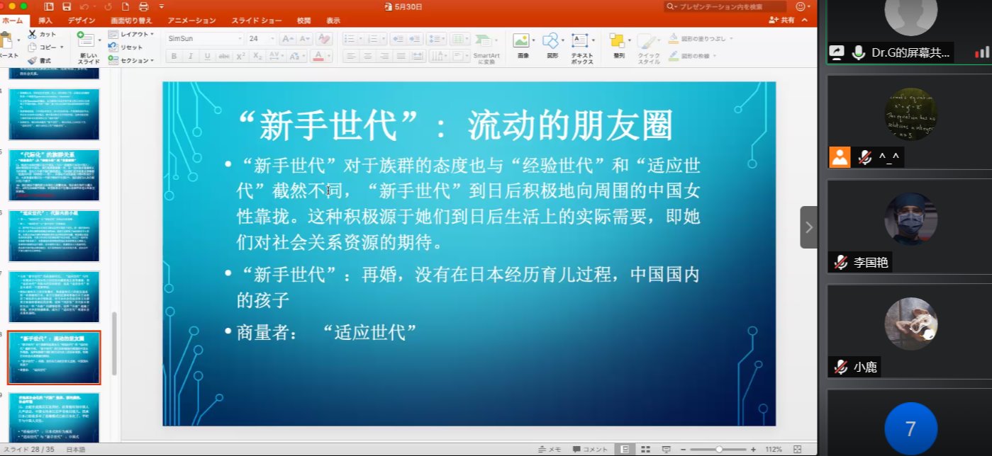 第三部分,胡源源指出即使来自同一族群的移民,因为在移民目的地的生活时间不同,由此带来的文化接受度也会存在差异。再加上移民的身份性质,母国的出身地区、结婚史等移民属性以及在地社会环境的变化等都影响着婚姻移民的社会关系。基于此,她将跨国来日结婚的女性划分为“经验世代”、“适应世代”以及“新手世代”。她通过展示对不同世代的女性的采访以及对其差异的分析等,向大家介绍了不同世代的特征,并在最后指出了影响这些差异的社会大背景。