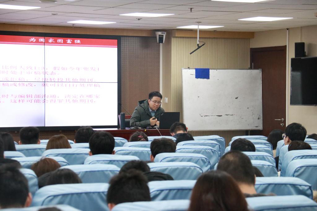 第一场“论文写作和学术规范”讲座在知新楼A1521举行,哲学系冯波副教授主讲,哲学系全体硕士生和博士生参加。