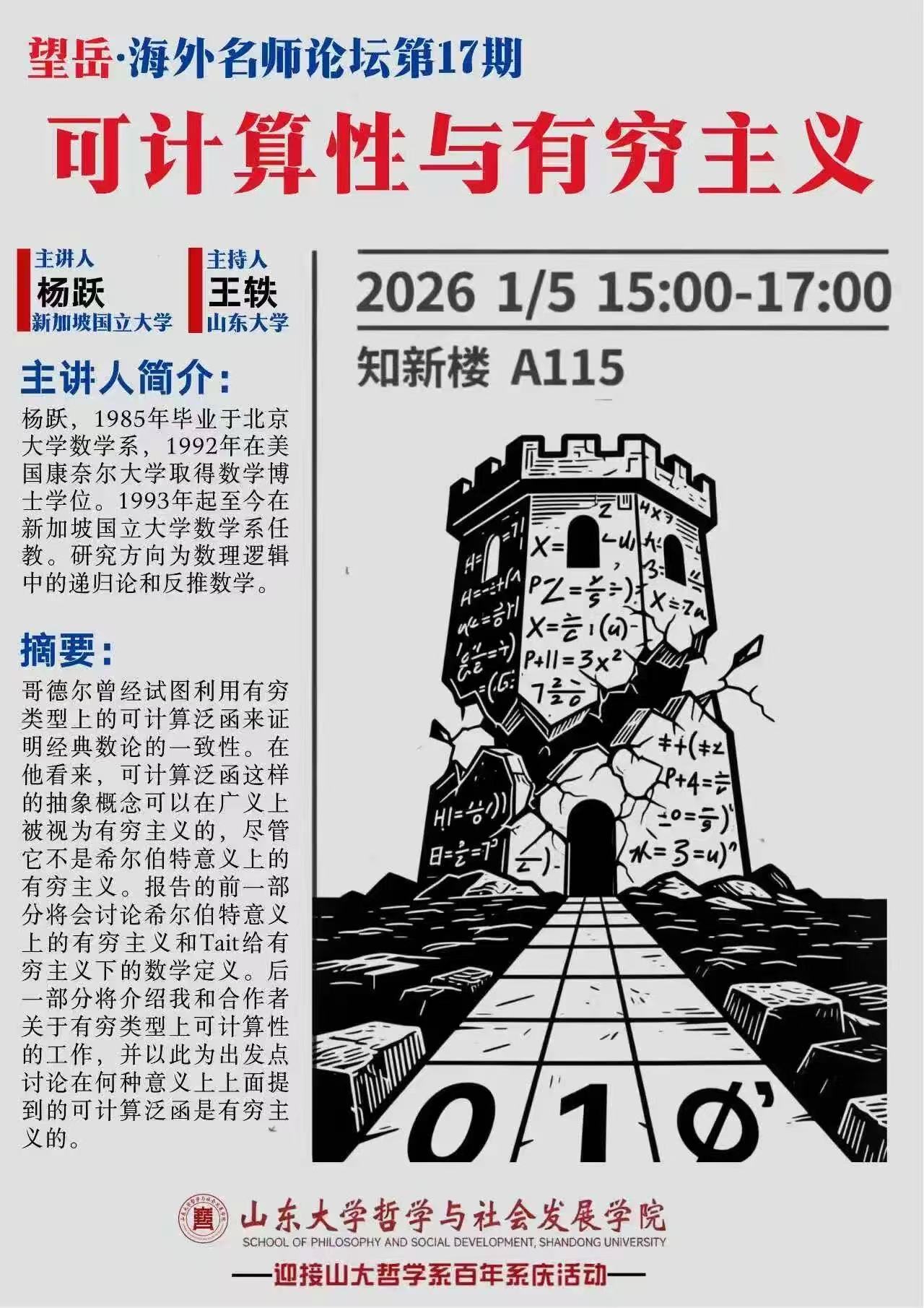哥德尔曾经试图利用有穷类型上的可计算泛函来证明经典数论的一致性。在他看来,可计算泛函这样的抽象概念可以在广义上被视为有穷主义的,尽管它不是希尔伯特意义上的有穷主义,见哥德尔[1972] “On an extension of finitary mathematics which has not yet been used”。报告的前一部分将会讨论希尔伯特意义上的有穷主义和Tait给有穷主义下的数学定义。后一部分将介绍我和合作者关于有穷类型上可计算性的工作,并以此为出发点讨论在何种意义上上面提到的可计算泛函是有穷主义的。