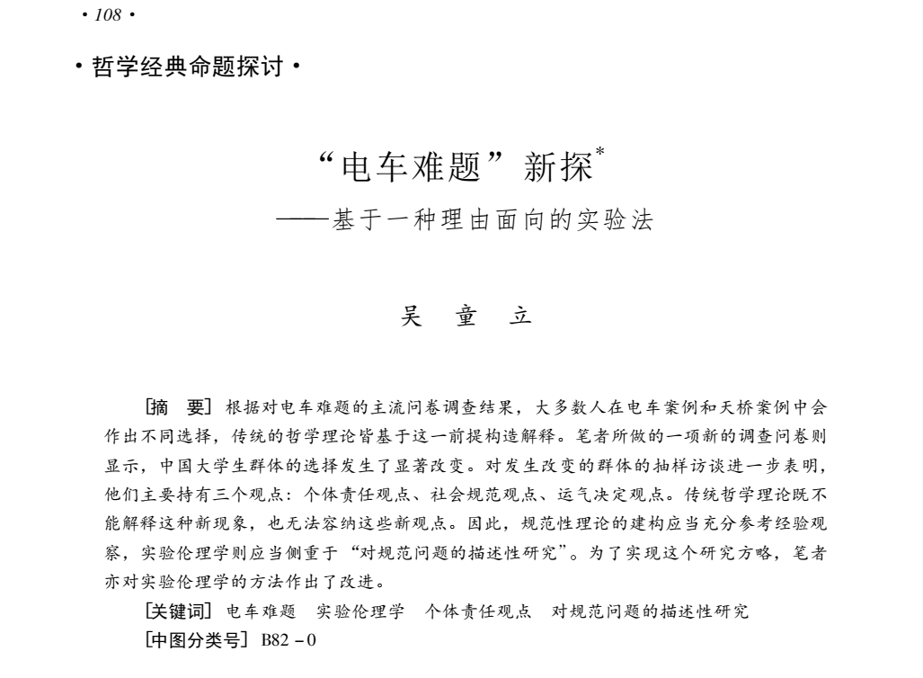 吴童立副教授所撰写的《“电车难题”新探——基于一种理由面向的实验法》一文在《哲学研究》2023年第2期上发表。“电车难题”可能是最广为人知的道德难题之一。世界范围内的多次调查实验表明,在“电车案例”与“天桥案例”两个相似的情形中大多数人做出了不同的选择,而“电车难题”要求从理论上说明为何如此。文章从两个疑问切入对这个难题的研究:第一,主流调查结果真的是基于一种“普遍道德语法”吗?第二,人们做出选择的真实理由与主流理论给出的说明相符合吗?从这些问题出发,作者在国内高校中进行了一次较大规模的问卷调查,共收到来自102所高校的1109份有效问卷,并且首次设计和使用了主要针对选择理由的问卷。