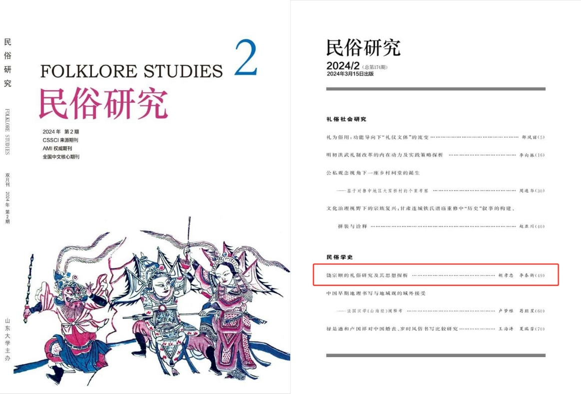 胡孝忠副教授与复旦大学博士研究生李泰衡共同在《民俗研究》2024年第2期上发表了题为《饶宗颐的礼俗研究及其思想探析》的高质量学术论文。