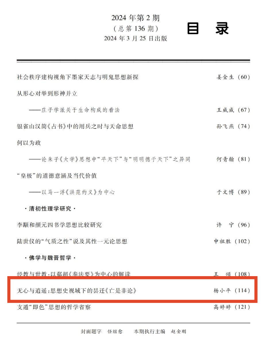 青年教师杨小平在《中国哲学史》2024年第2期上发表了题为《 无心与逍遥:思想史视域下的昙迁<亡是非论>》的高质量论文。