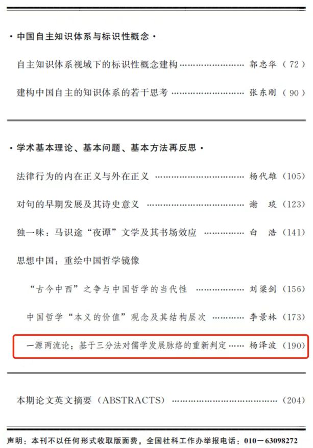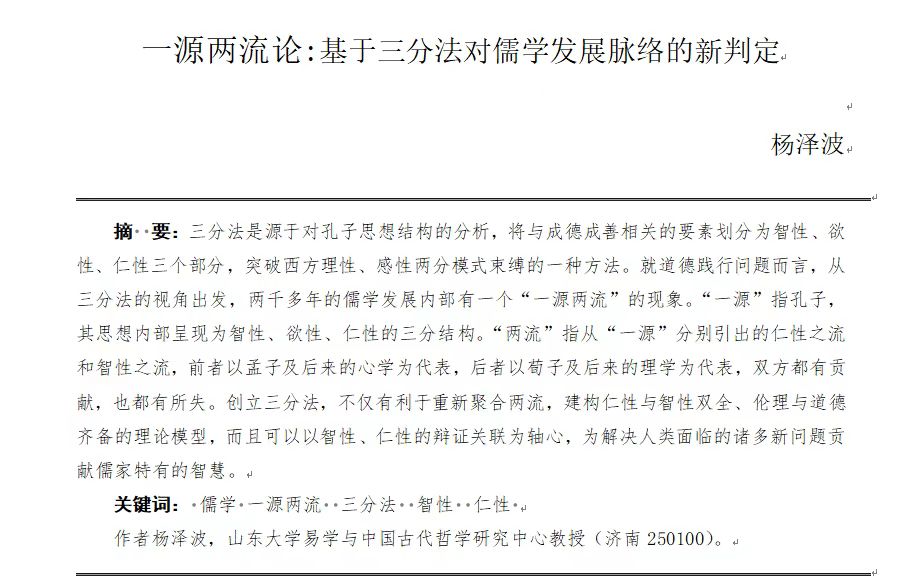 近日,山东大学易学与中国古代哲学研究中心杨泽波教授撰写的《一源两流论:基于三分法对儒学发展脉络的新判定》一文在《中国社会科学》2024年第5期发表,全文16000字。