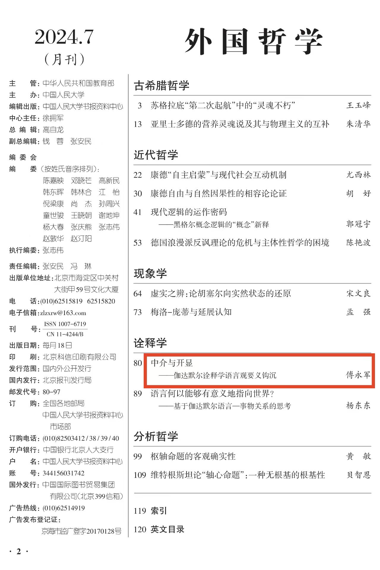 傅永军教授的题为《中介与开显——伽达默尔诠释学语言观要义钩沉》的高质量论文。