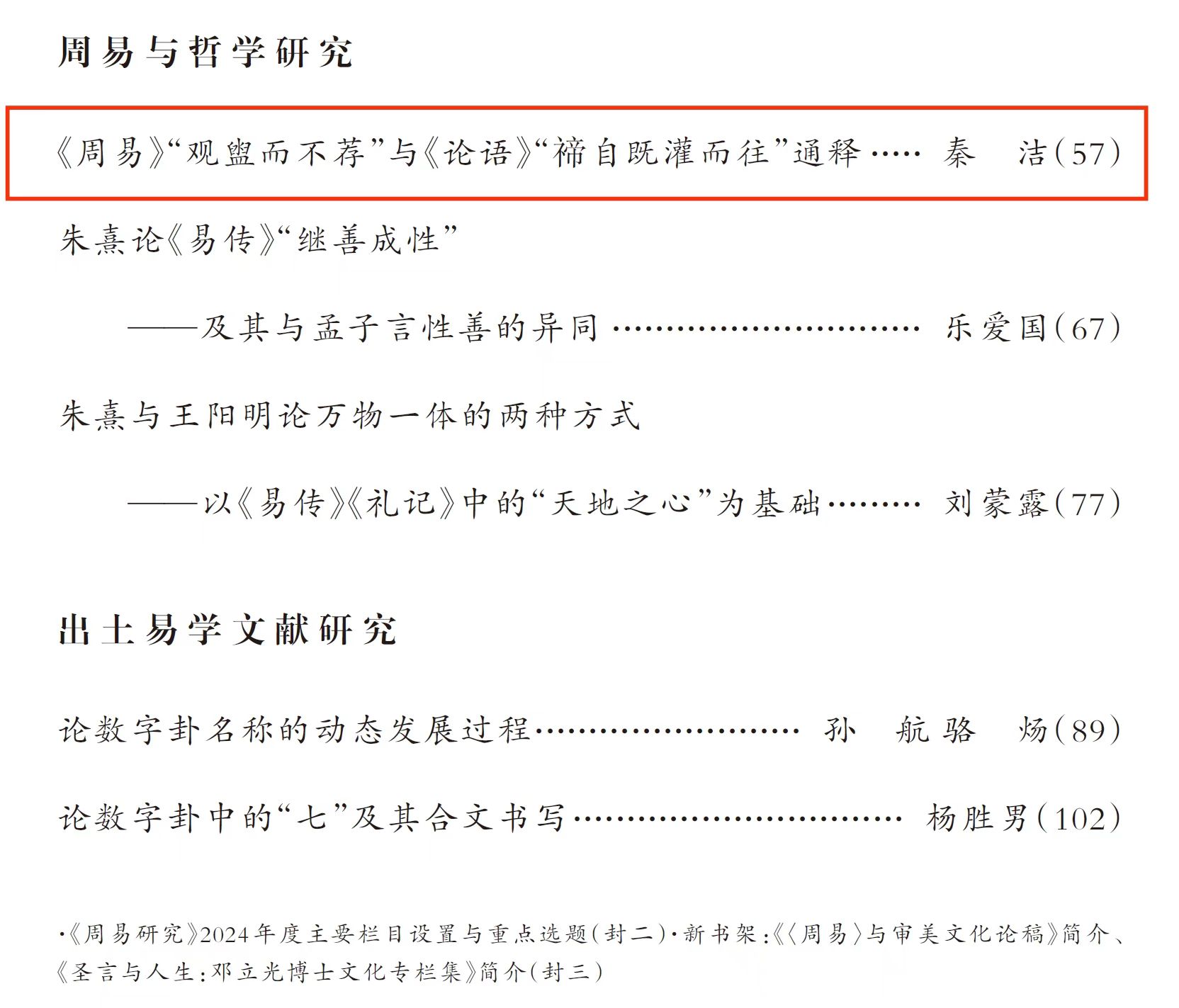 近日,山东大学易学与中国古代哲学研究中心助理研究员秦洁在《周易研究》2024年第5期上发表了题为《<周易>“观盥而不荐”与<论语>“禘自既灌而往”通释》的高质量论文。