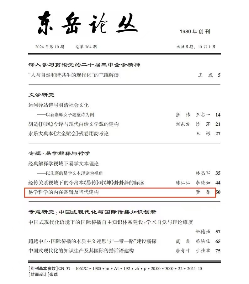 近日,山东大学易学与中国古代哲学研究中心董春副教授在《东岳论丛》2024年第10期上发表了题为《易学哲学的内在逻辑及当代建构》的高质量论文。