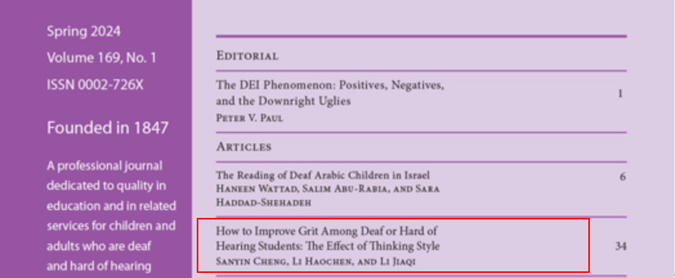 程三银教授以第一作者身份撰写的文章“How to Improve Grit Among Deaf or Hard of Hearing Students: The Effect of Thinking Style”在American Annals of the Deaf 期刊上发表。