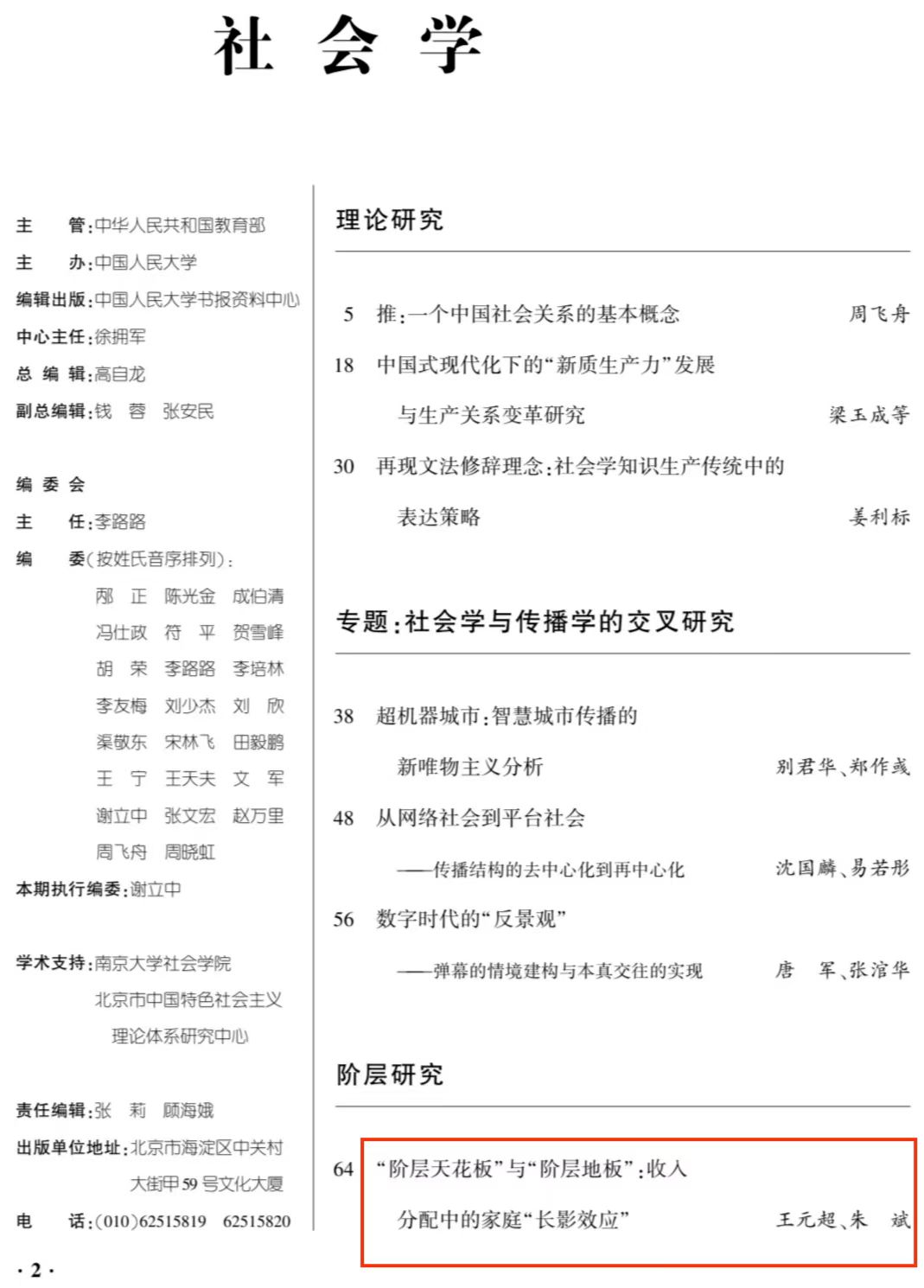 助理研究员王元超与中国人民大学副教授朱斌共同发表的题为《“阶层天花板”与“阶层地板”:收入分配中的家庭“长影效应”》的高质量论文,该文原载于《社会学评论》2024年第3期。