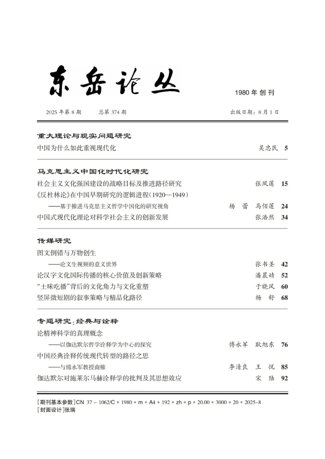 傅永军教授与博士研究生耿旭东共同在《东岳论丛》2025年第8期发表了题为《论精神科学的真理概念——以伽达默尔哲学诠释学为中心的探究》的高质量论文。