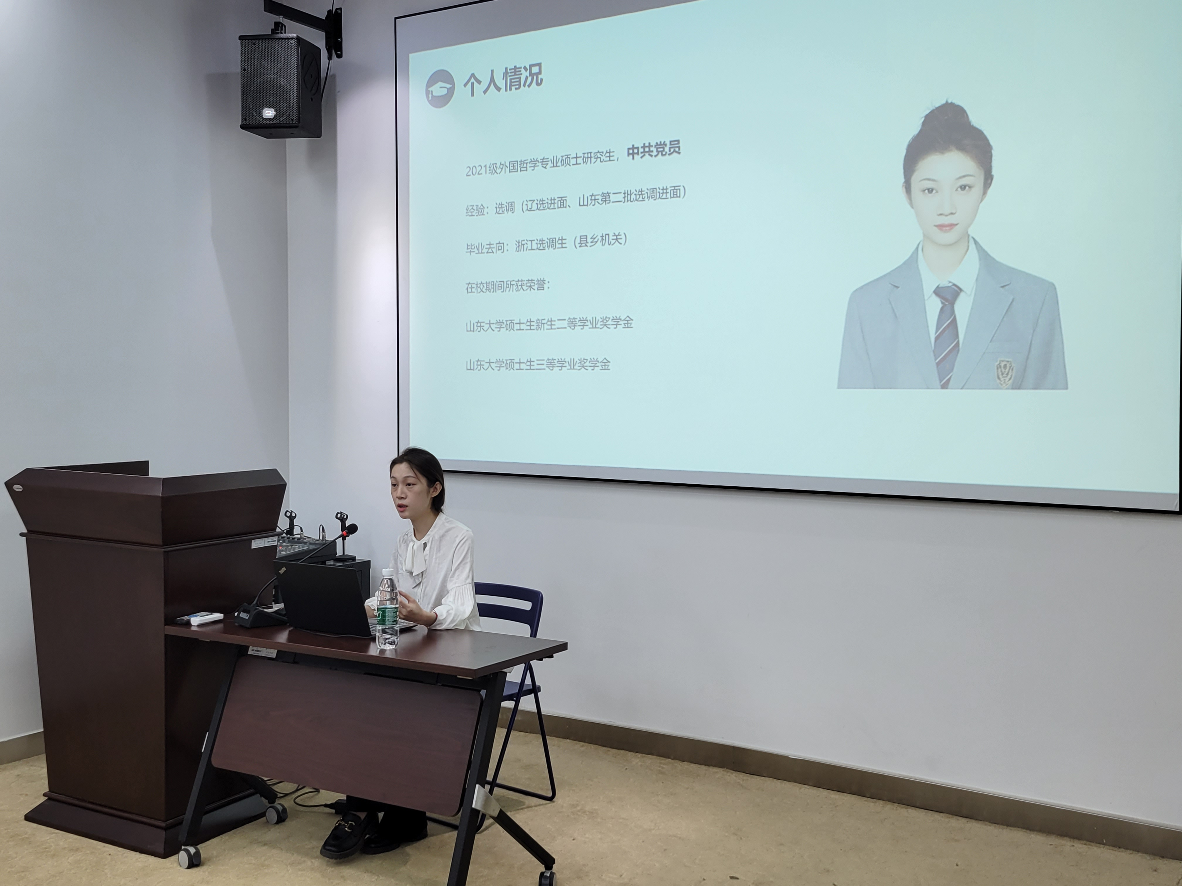 2021级外国哲学专业硕士研究生孙昌洋子从明确选岗意向、找准方法渠道、把握备考节奏等方面分享了备考浙江省选调的经验,她特别强调了在备考过程中应该制定合理科学的阶段计划,保持积极稳定的心理状态。