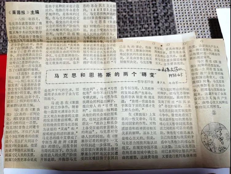 周向军、王志功同学1981年7月1日发表在山东大学校报上的文章《马克思和恩格斯的“转变”》。