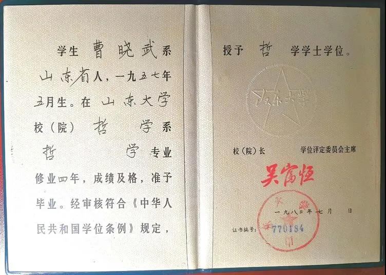 1982年11月底,同学们陆续收到学校教务处寄来的《学士学位证书》,成为山东大学根据《中华人民共和国学位条例》审核授予的首批“山东大学哲学学士”。
