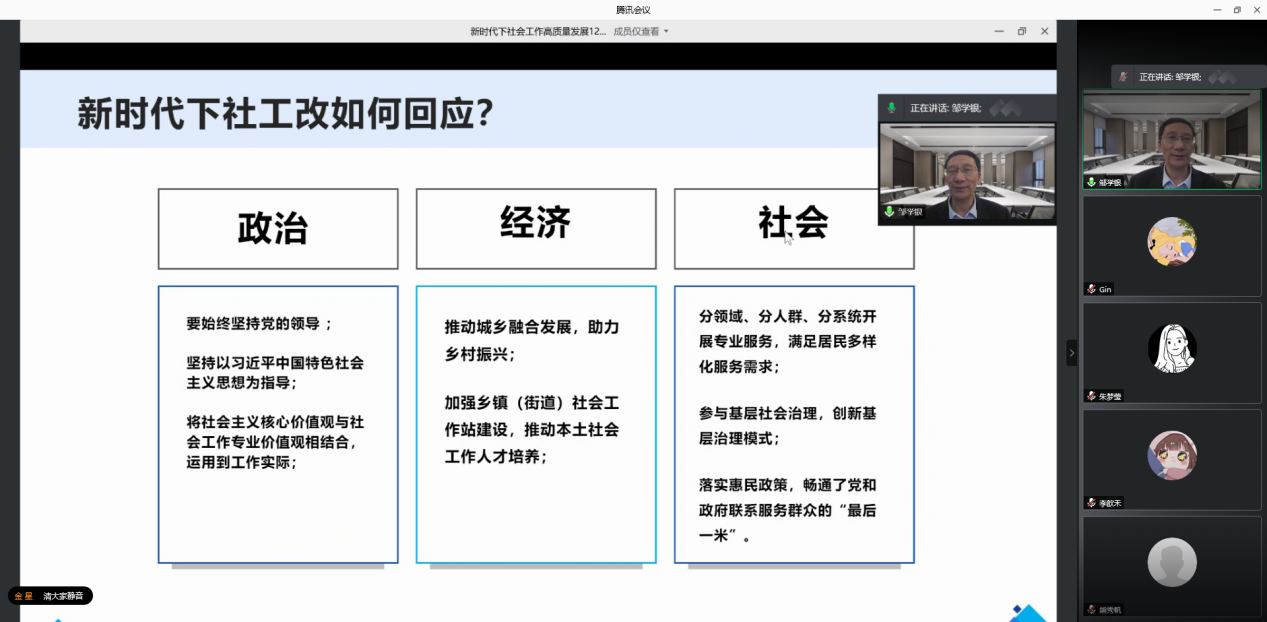 最后,程胜利副院长在总结中提到,邹秘书长为我们梳理了社会工作发展的历程和现状并从六个方面谈了新时代社会工作高质量发展的路径,为各位老师和同学们提供了“抬头看路”的视野,同时也帮助同学们进一步了解了社会工作专业的发展对新时代的重要意义。