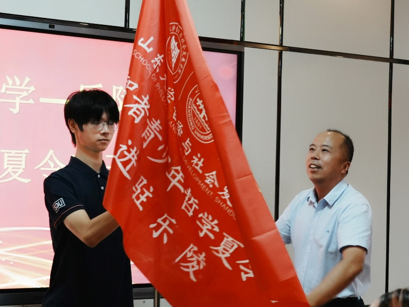 丁红春书记向乐智者乐陵实践团队授旗,标志着bet007足球比分 示范性学生社会实践项目——乐智者哲学夏令营正式启动。