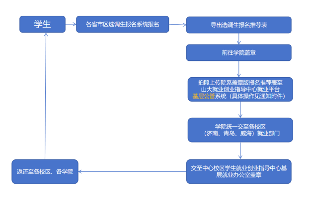 2.同时,考生均需登录山东大学学生就业创业指导中心基层公管系统填写登记信息,并在附件位置上传院系盖章版《报名表》进行报名登记。我处不受理未在基层公管系统登记的《推荐表》。(系统操作请见附件)