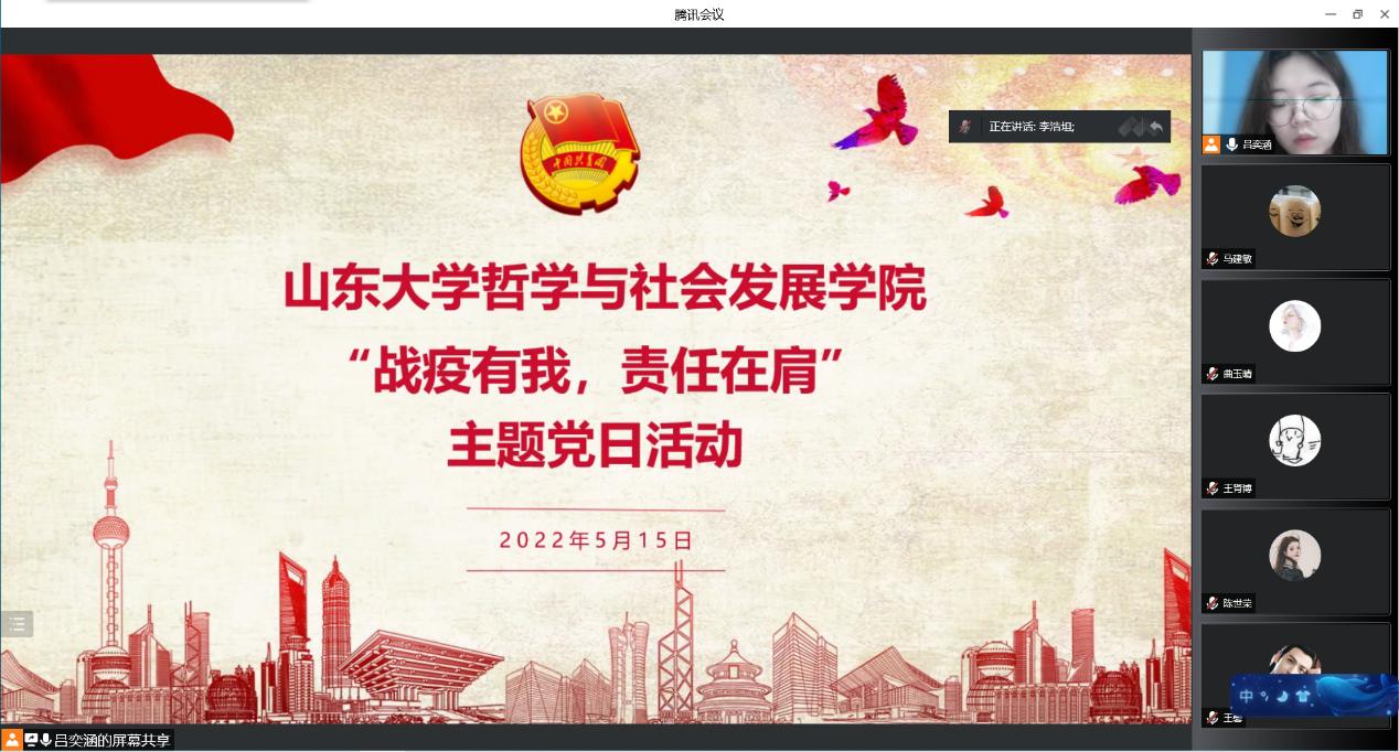 在这次抗击新冠肺炎疫情的严峻斗争中,山东大学全体上下闻令而动,动则有力。会上,全体党员结合校园封闭管理生活及转运隔离期间的所见、所闻、所感、所思进行个人汇报。一方面,党员们对无数冲锋在前、默默付出的教职员工、医务工作者、方舱工作人员表示诚挚的敬佩与感激,是他们用责任与坚守为学校师生的基本生活和健康安全保驾护航。另一方面,党员们纷纷表示,在积极配合学校和学院工作的同时,应当发挥模范带头作用,在最需要的时刻挺身而出,主动投身抗疫一线,展现青春风采。