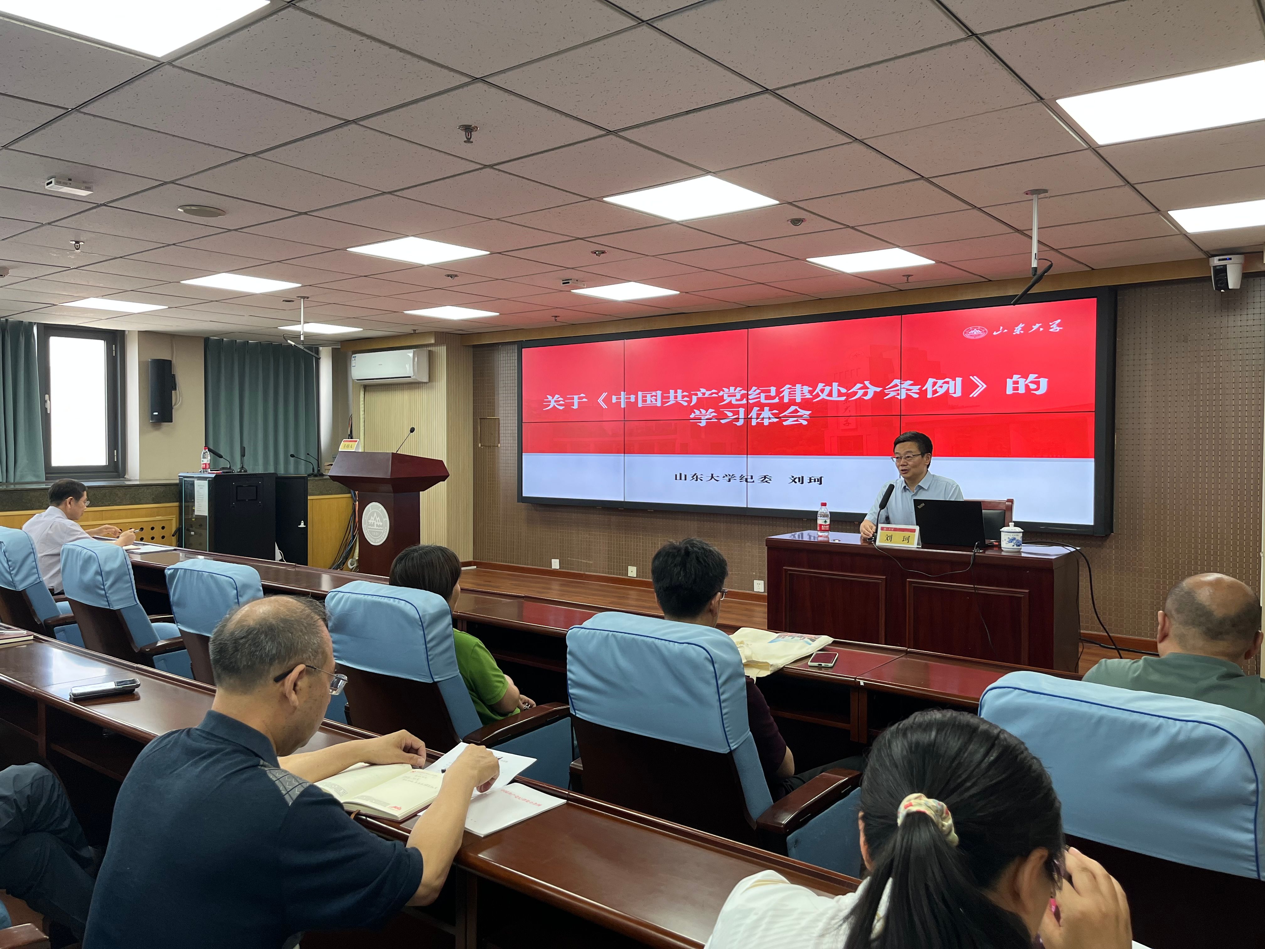 召开党纪学习教育专题辅导报告会,山东大学纪委副书记刘珂应邀作题为“关于《中国共产党纪律处分条例》的学习体会”的专题辅导报告。学院党委书记梅强主持报告会。学院全体教工党员、学生党员代表参加报告会。