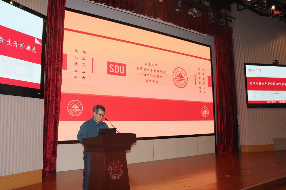 在系主任寄语环节,哲学系主任吴童立副教授、宗教学系主任陈坚教授、社会学系主任林聚任教授、社会工作系主任葛忠明教授、人类学系彭馨妍老师分别从学科内涵、文化解读、视野格局、个人成长、全面发展等多个方面向新生进行了介绍,对同学们表示热烈欢迎并送上美好祝愿。