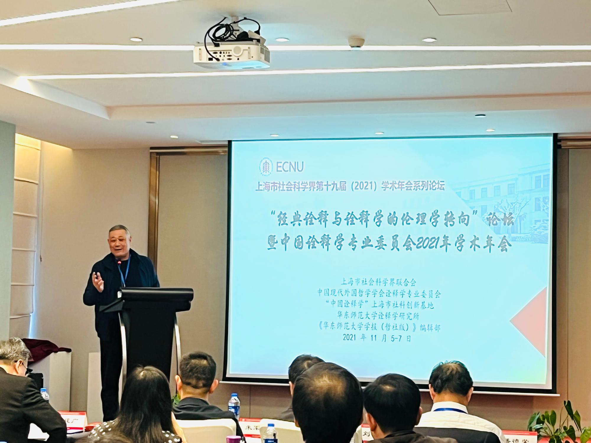 2021年11月5-7日,由上海市社会科学界联合会主办,中国现代外国哲学学会诠释学专业委员会、“中国诠释学”上海市社科创新基地、华东师范大学诠释学研究所和《华东师范大学学报(哲社版)》编辑部承办的“经典诠释与诠释学的伦理学转向”学术论坛暨2021中国诠释学专业委员会年会在上海成功召开。来自华东师范大学、山东大学、华中科技大学、复旦大学、同济大学、大连理工大学、上海大学、安徽大学、广西大学、安徽师范大学、上海师范大学、重庆大学、苏州大学以及湖南大学岳麓书院等40多所高校和科研院所的八十多位专家、学者参加了此次会议。