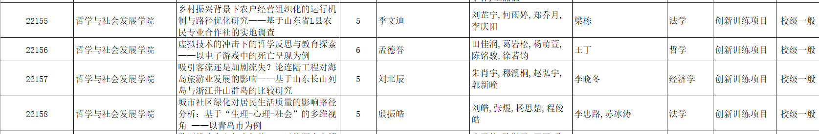 另有梁栋老师指导的《乡村振兴背景下农户经营组织化的运行机制与路径优化研究——基于山东省L县农民专业合作社的实地调查》、王丁老师指导的《虚拟技术的冲击下的哲学反思与教育探索——以电子游戏中的死亡呈现为例》、李晓东老师指导的《吸引客流还是加剧流失?论连陆工程对海岛旅游业发展的影响——基于山东长山列岛与浙江舟山群岛的比较研究》、李忠路和苏冰涛老师指导的《城市社区绿化对居民生活质量的影响路径分析:基于“生理-心理-社会”的多维视角——以青岛市为例》4个项目获推校级项目。