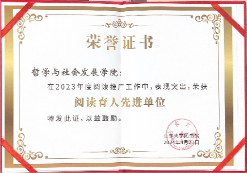 积极鼓励学院师生多读书、读好书,在山东大学2023年度阅读推广工作中表现突出,荣获阅读育人先进单位称号,学院陈治国老师荣获“教师借阅达人”称号。