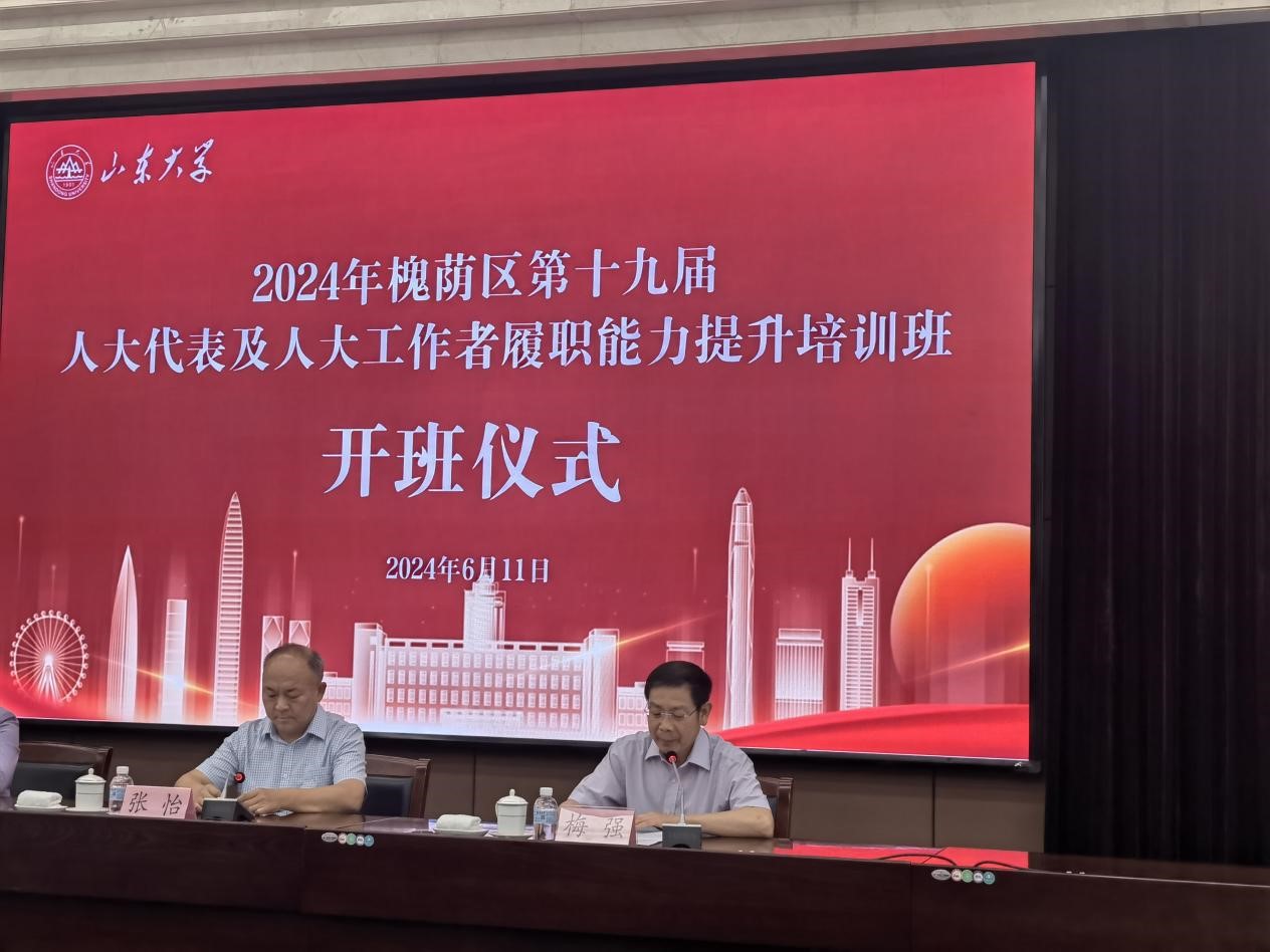 梅强在开班典礼上致欢迎词。他表示,山东大学将一如既往秉持“家国情怀、担当精神、崇实品格、创新素养”的独特“山大基因”,不断提高服务山东经济社会发展的能力和水平,努力推进槐荫区城区综合实力跨上新台阶。张怡在开班典礼上作动员讲话。他强调,参训学员要珍惜本次学习机会,深化认识、勤学善思,做到学有所成、学有所获、学以致用,将培训成果转化为做好代表工作的能力和动力。