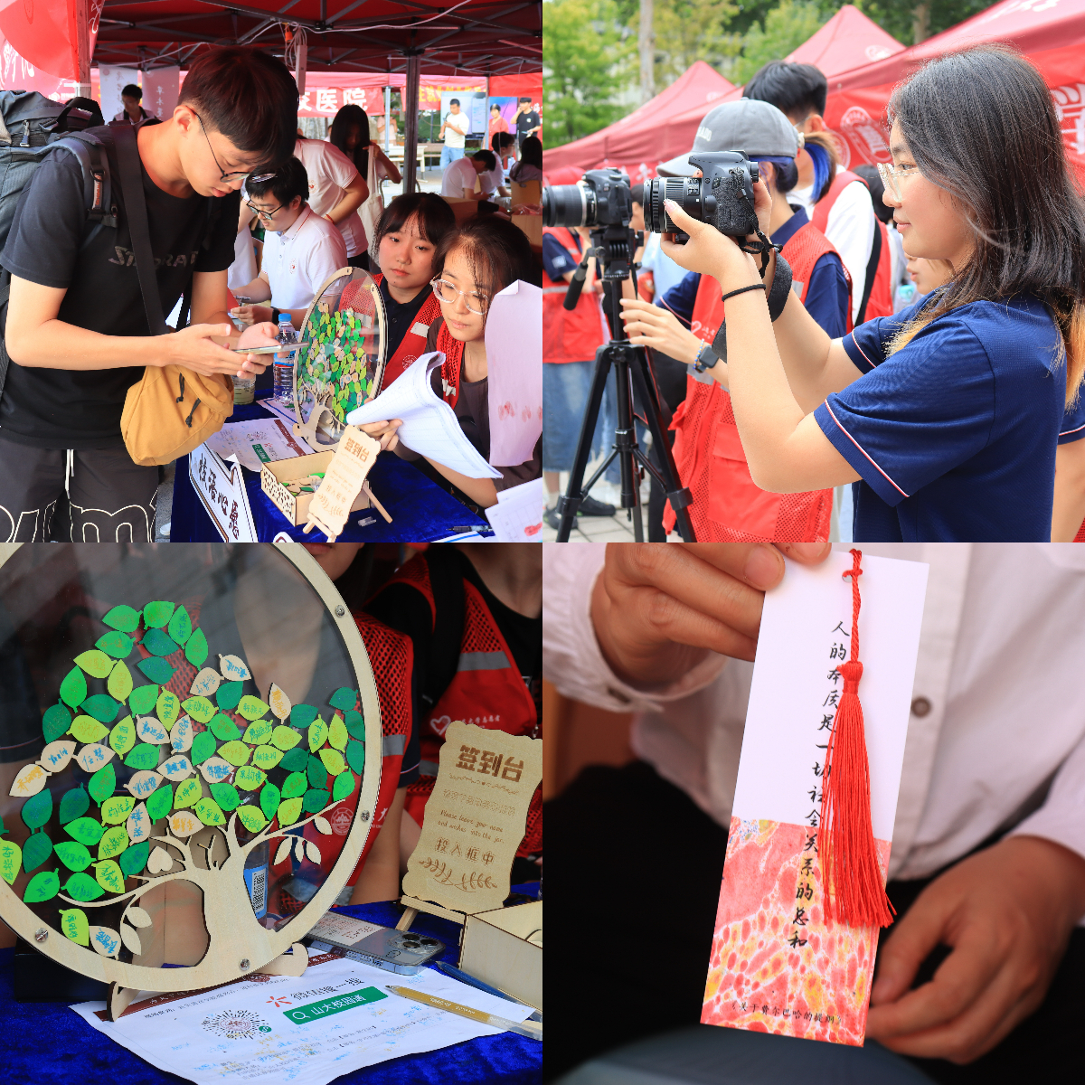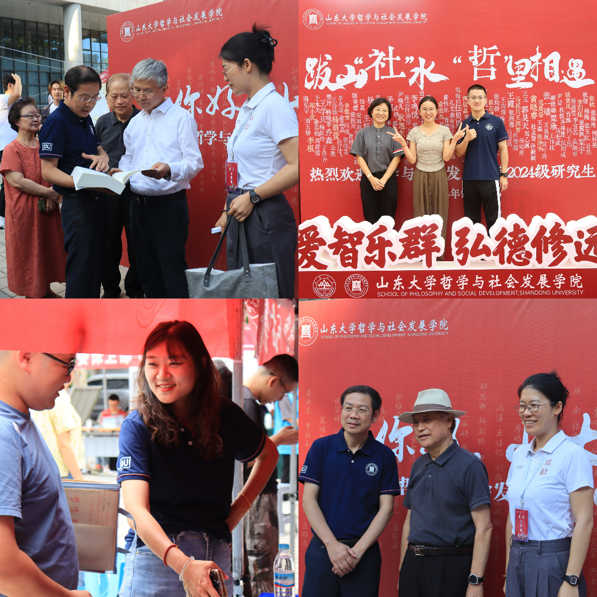 在迎新接待环节,70余名学院学生组织成员和志愿者以“微笑迎新,暖心服务”为工作宗旨,严格依循工作规范与接待程序,在现场开展接站引导、辅助签到、人像核验、扫码报到、资格审查、非遗体验等工作,竭诚为2024级新生及随行家长带去迅捷、便利、周到的接待服务。学院媒体与创意中心成员穿梭来往,引导新生及其随行家长在印有全体本科新生姓名的“你好,山大人”学院迎新展板前合影留念,为新生留下迎新日的美好留念。同时,学院为全体新生准备了“青春行囊”入学礼包:文创卡套与哲社文件袋兼具实用与美观,《知新文萃》与哲社专著尽显学术文化底蕴,新式藏青色院服标记出“哲社人”独特的风采。“枝语心愿”树形签到板、“明辨之门”身份核验台、“哲社通途”校园卡发放处、“携钥为家”宿舍钥匙分发点、“文韵风华”青春行囊发放处、“智群彩韵”漂染工艺体验台等展台协同配合,为全体报到新生带去流畅便捷的“一条龙报到、一站式服务”。醒目的深红欢迎条幅、全体迎新工作者温暖细致的服务、精致可爱的学院文创,令迎新现场满溢着家的温馨。