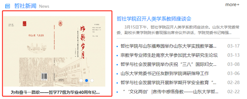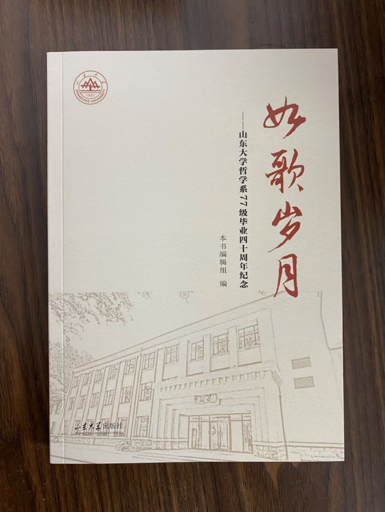 2023年10月初,在山东大学建校122周年校庆来临之际,《如歌岁月—山东大学哲学系77级毕业40周年纪念》在山东大学出版社出版,《如歌岁月》由上篇“春风四十忆华年”及下篇“往事悠悠总是情”组成,共320多页约34万字。77级校友是恢复高考后的首届大学生,是亲历时代变迁、肩负历史使命的一代山大人,《如歌岁月》不仅是77级哲学校友集体记忆的沉淀,更是对伟大祖国和时代声音的记录和镌刻,展现了山大校友的奋斗风采、山大人的时代精神以及这一代青年人投身于国家建设、民族振兴的责任与担当。