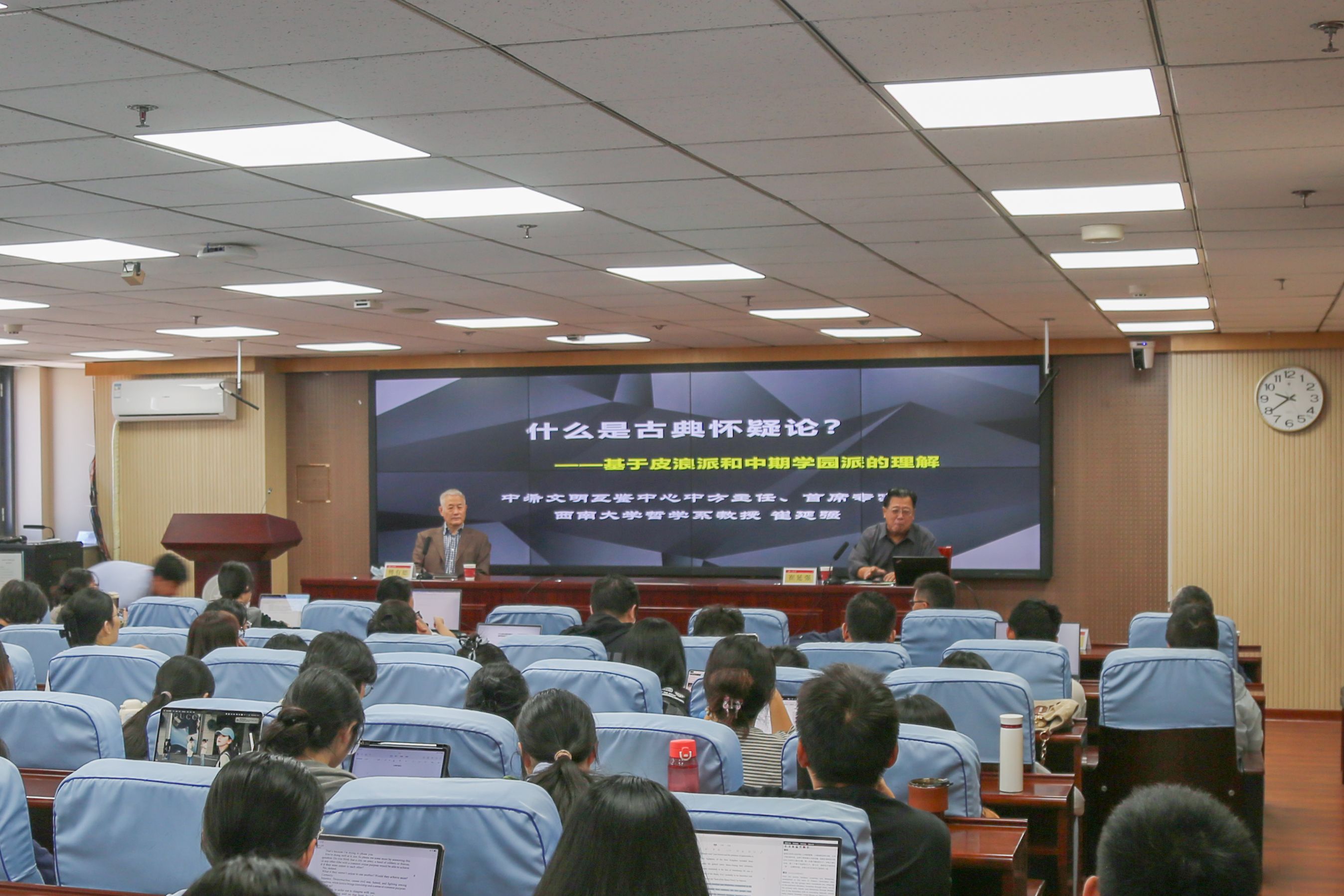 傅有德表示,怀疑论是非常重要的派别,然而在今天的西方哲学领域存在着重视程度不够的现象。古典怀疑论持续到康德,都是对希腊怀疑论的回应,这足以展示出怀疑论的意义。而崔延强除了提到希腊哲学怀疑主义的代表人物,还谈到了以罗蒂为代表的西方哲学家,同时将他们与中国哲学家庄子、王阳明相比较,展现出了其对中西哲学知识融会贯通的理解。