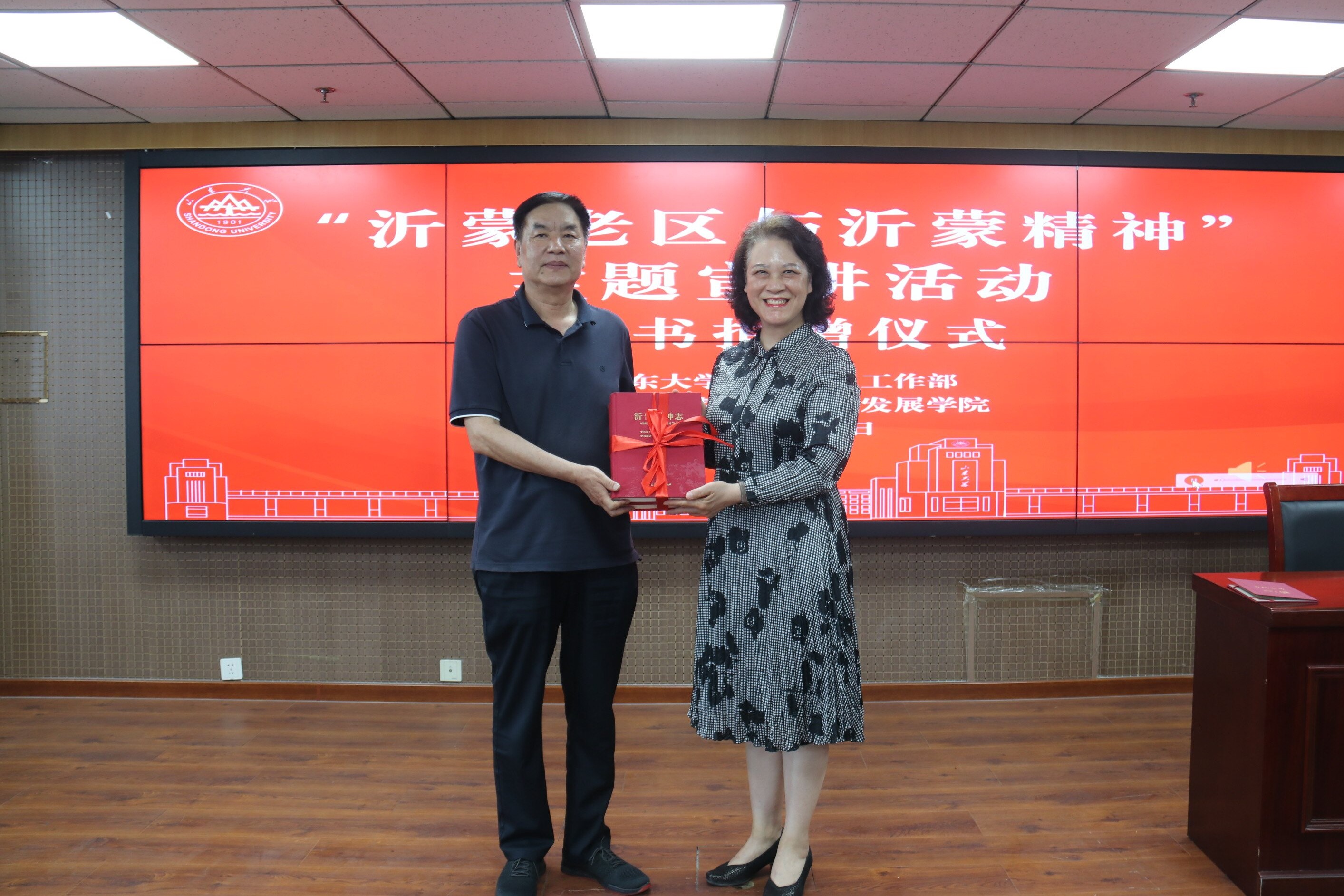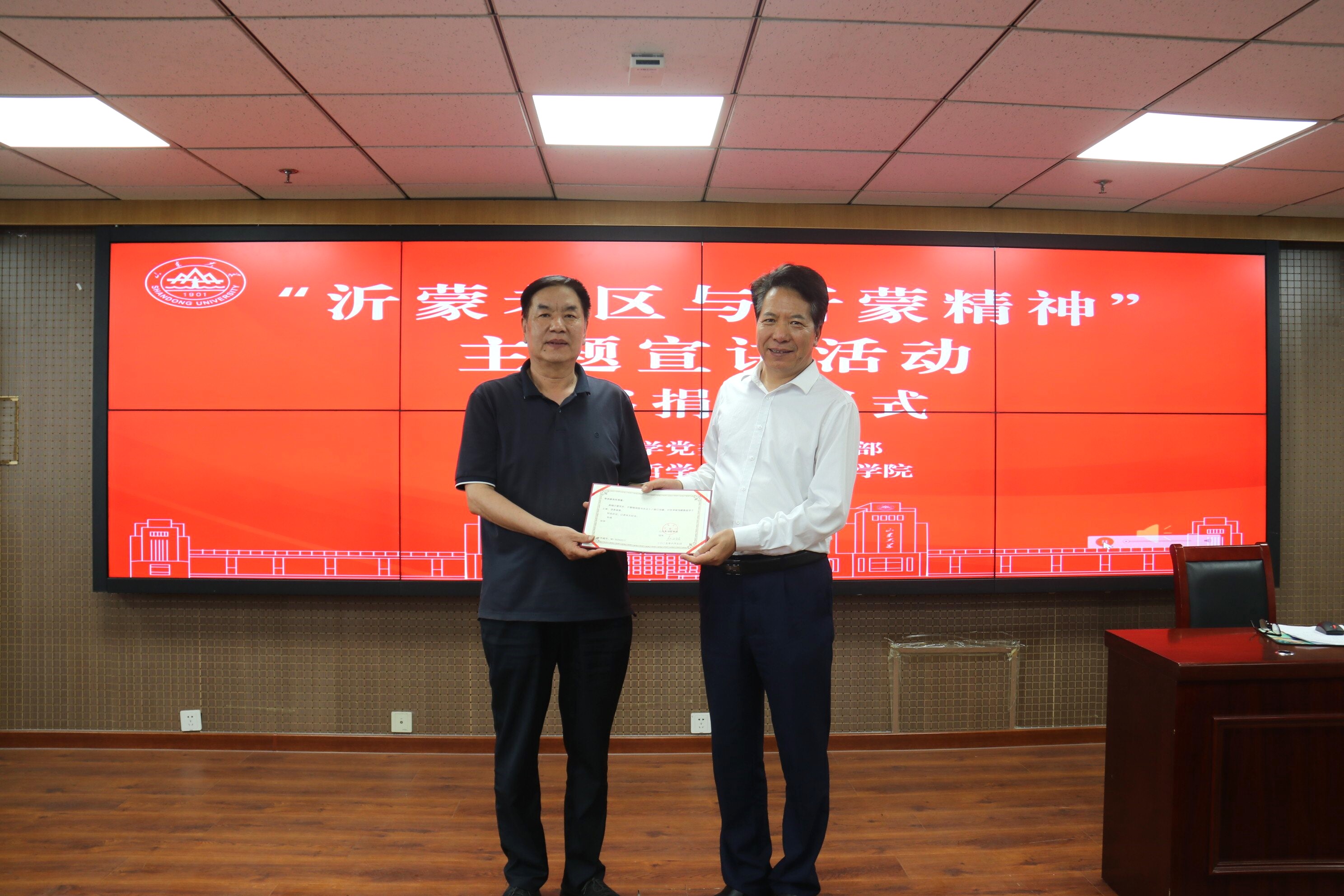 活动伊始,山东大学哲学系1983级校友李洪彦向山东大学图书馆捐赠了沂蒙党史、沂蒙精神图书共五十八册。在图书捐赠仪式上,曹现强向李洪彦颁发捐赠证书,汲言斌代表学校接受捐赠图书并表达诚挚感谢。