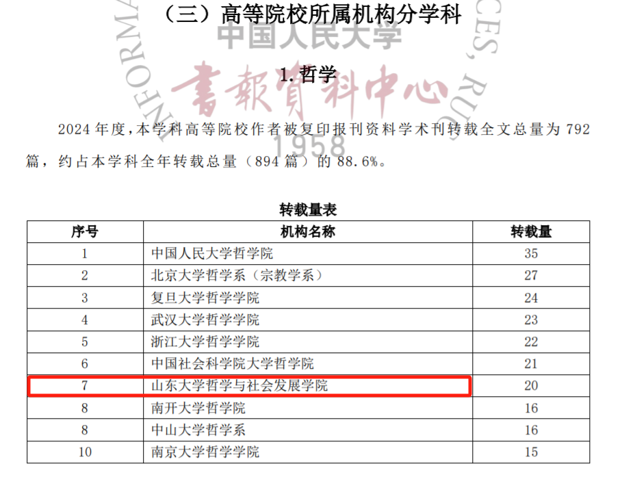 入选“复印报刊资料重要转载来源机构(2024年版)”,且在《复印报刊资料转载指数研究报告(2024年度)》中位列哲学学科机构第7名。
