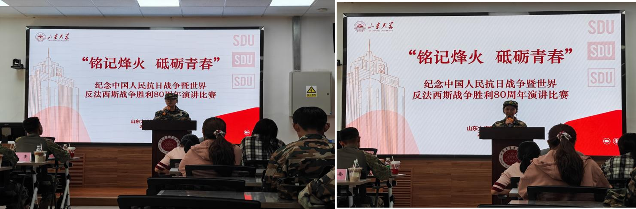 在紧张严肃的军事训练之余,学院精心策划了一系列入学教育活动,助力新生熟悉校园,体悟大学生活,让学生在迷彩戎装中,也能感受文化与思想的滋养。集体观看九三阅兵仪式,感悟大国崛起,铭记抗战历史;学院邀请校医院开展安全知识讲座,以温和话语叮嘱卫生防护要点;组织参观校史馆,透过历史资料与厚重展陈,触摸学术传统脉络,领略山大精神传承。学长学姐组织破冰活动,在游戏中拉近彼此距离;共同唱响山大校歌,激荡崇实求新的学子情怀;在“铭记烽火 砥砺青春”的激昂朗诵中,80年抗战情怀在山大土地上延续。这些活动,不仅拓展了军训的维度,更让同学们在体魄锻炼之外,实现精神的充实与视野的开阔。