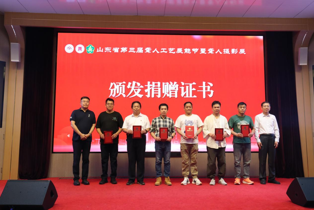 党委书记梅强、山东大学残疾人事业发展研究中心主任葛忠明共同为艺术家代表们颁发捐赠证书。