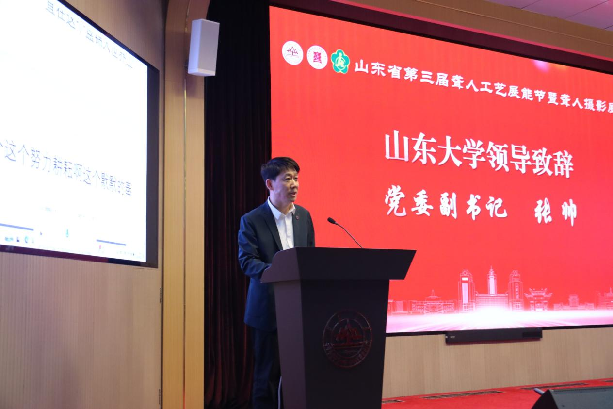 山东大学党委副书记张帅在致辞中对到场嘉宾表示热烈欢迎。他表示,本次活动的举办充分体现了“科技与艺术融合”的深刻内涵,为社会各界提供了了解聋人文化的窗口。山东大学作为国家重点高校,将充分发挥在人才培养、学术研究、平台搭建等方面的综合优势,持续深化与省残联、省文联等部门的协同合作,共同推动残健融合向更深层次、更广领域发展,并重点提出四个方面的举措:一是完善无障碍环境与服务保障;二是深化课程科研与社会服务联动;三是壮大志愿服务与社会实践力量;四是以文化人、以美育人,放大向善向美的校园合力。