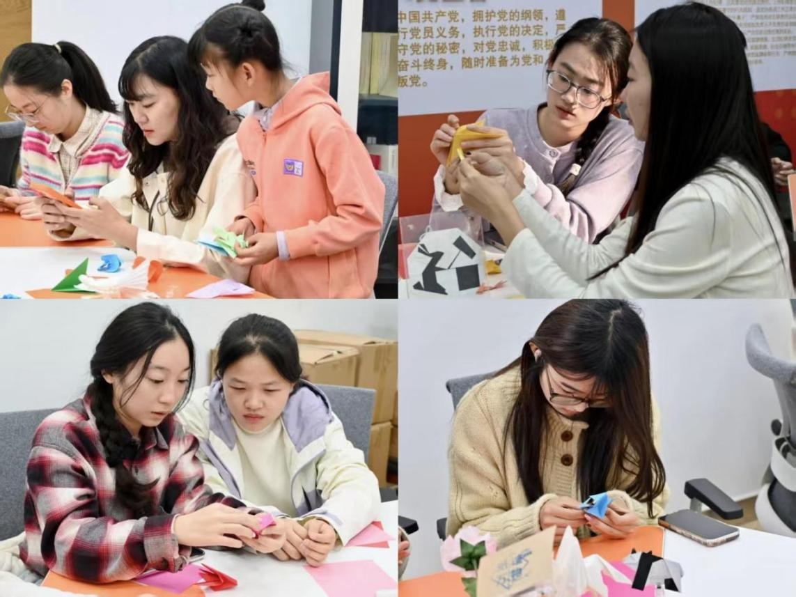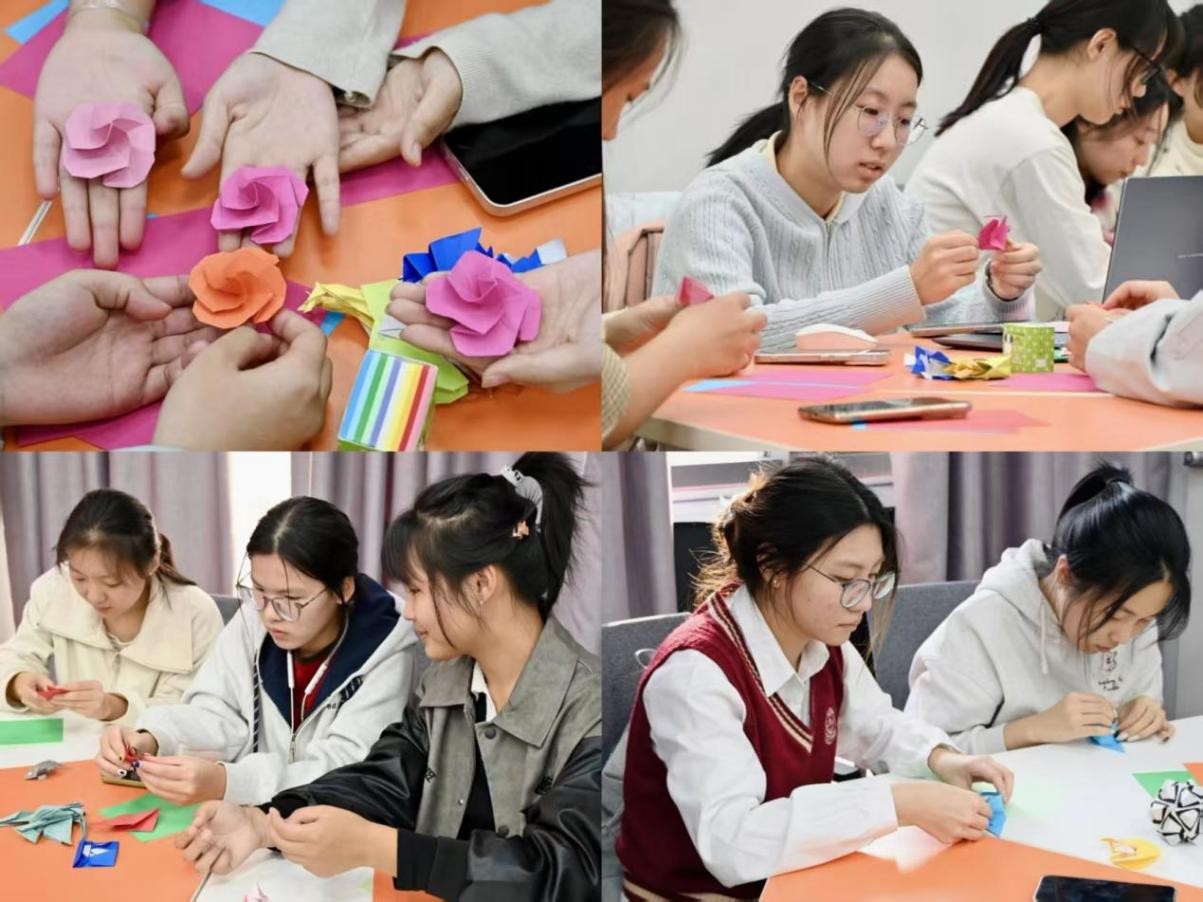 活动通过“数字抱团”游戏进行分组,其中未能成功抱团的三名同学以猜字互动助兴,欢声笑语中拉近了参与者距离。随后,纸艺社团负责人彭俊翔、程嘉昌开展专业指导,细致讲解蝴蝶、玫瑰花等折纸技巧,引导师生沉浸式投入手工创作。在自主创作环节,各小组成员分工协作、创意互补,在裁剪、折叠、拼接的专注实践中脱离烦忧、舒缓心绪,深化心理联结。