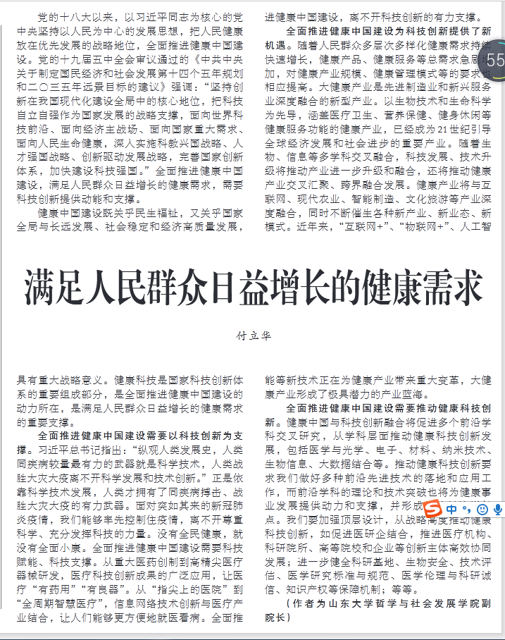 11月13日,《人民日报》(09版)刊发了我院付立华副教授撰写的理论文章《满足人民群众日益增长的健康需求》。文章认为,健康中国建设既关乎民生福祉,又关乎国家全局与长远发展、社会稳定和经济高质量发展,具有重大战略意义。健康科技是国家科技创新体系的重要组成部分,是全面推进健康中国建设的动力所在,是满足人民群众日益增长的健康需求的重要支撑。