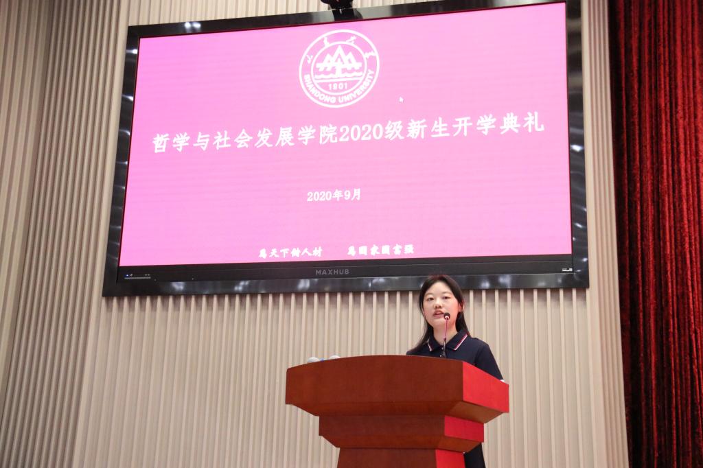 2020级中国哲学专业博士研究生刘萍和2020级社会学专业本科生张沁涵作为新生代表发言。刘萍希望能心怀对学术的敬畏,一步一个脚印地朝着目标不懈努力,创造价值,挺立起自身的生命主体性。张沁涵表示,作为山大的“后浪”,应该秉持家国情怀,不负韶华,重新出发。坚定方向、拓展格局,追求卓越、砥砺前行,在新的征途中谱写出精彩的青春华章。