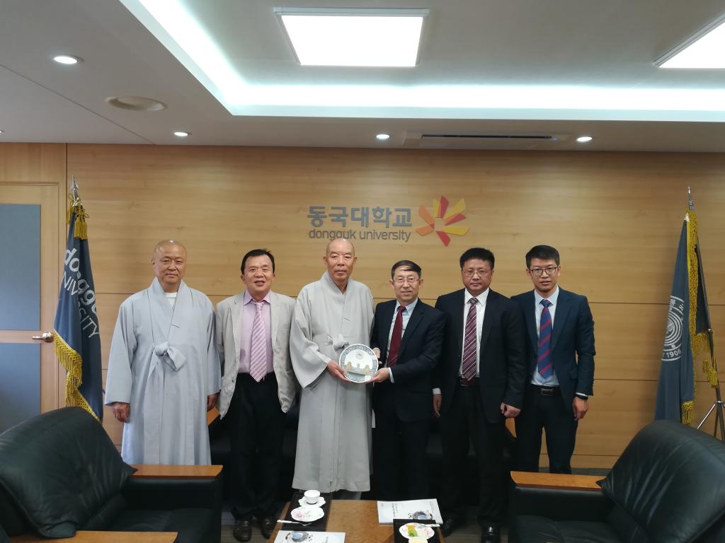 6月7日上午,陈坚教授、牛建科教授、李海涛副教授会见了东国大学韩泰植(普光)校长、东国大学佛教学院院长申景贤教授、东国大学佛教学院原院长宗浩法师等,双方交换了彼此对于东亚佛教的认识,希望通过两校间的学术交流来推动中韩佛教学术研究的发展。代表团向东国大学赠送了山东大学校景盘及中心主办的学术刊物《犹太研究》和《东亚宗教》。东国大学校长普光法师也为山东大学代表团赠送了纪念品。