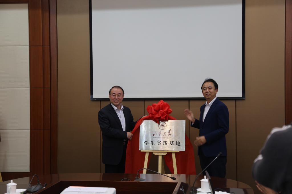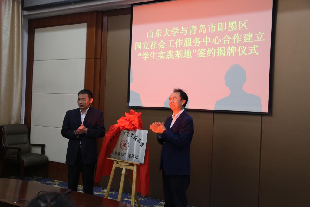 、政治学与公共管理学院、法学院联合在即墨区国立社会服务中心建立实践基地,必将是双赢的合作,迸发出更强大的社会公益力量。宋修强在讲话中表示,学生社会实践基地的建立,实现了即墨区社会组织与山东大学优质资源的有机结合和优化配置,为即墨区社会组织发展和山东大学人才培养搭建了新的平台。即墨区国立社会工作服务中心主任王文华介绍了基地共建情况。山东大学(青岛)团工委书记张杨与王文华代表双方在合作协议上签字。宋宗军、郭邦礼共同为“学生实践基地”揭牌,宋宗军、宋作标共同为“四社联动课题组”揭牌。
