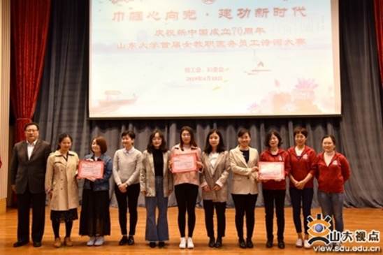 为了深入学习贯彻习近平新时代中国特色社会主义思想和党的十九大精神,继承和弘扬中国优秀传统文化,加强教职工校园文化建设,校工会、妇委会主办的“巾帼心向党·建功新时代”庆祝新中国成立70周年山东大学女教职医务员工诗词竞赛活动在中心校区举行。校党委常委、宣传部部长桑晓旻出席活动并为获奖单位颁奖。