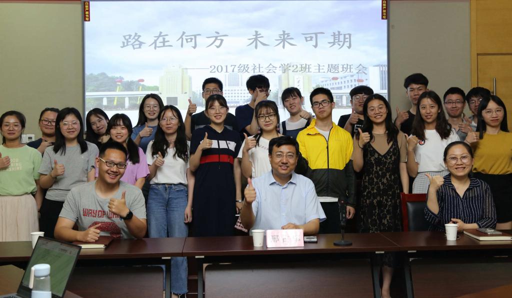 2017级社会学二班“路在何方?未来可期”主题班会的现场。社会学二班团支书张文佳首先向本次班会出席的老师及参与成员表示欢迎,并简要介绍了班级概况,借助多媒体,图文并茂,生动形象地展现出社会学二班的青春风貌,社会学二班积极踊跃参与校园各项活动,团结友爱,奋进向上,书写着属于自己的班级故事。然后就班会的主题进行了带头分享提问。张文佳提到时光转眼进入到大三,又即将走到一个至关重要的人生岔路口,面临到未来发展的抉择,就业还是考研?尤其是外部就业环境的多样性和内部院校研招率的扩招现状,哪一个选择都会有多种可能,可以算得上是“幸福的烦恼”,让同学们更加纠结如何选择。其他同学也都就自己当前的生活学习状态、未来的规划发展做了分享,同时围绕有关学涯、生涯发展和心理认知等困扰自身的问题向邢占军等在场老师寻求建议。邢占军一一耐心解答了所有同学们提出的关于当下学习、成长及未来发展规划的问题。同学们从老师的回答中收获颇丰,受益匪浅,对自己的现在和未来有了更清晰的规划和安排。社会学二班的同学表示会把握现在,脚踏实地学习好专业知识、提升好专业技能,向着未来努力奋进,为社会主义事业添砖加瓦。
