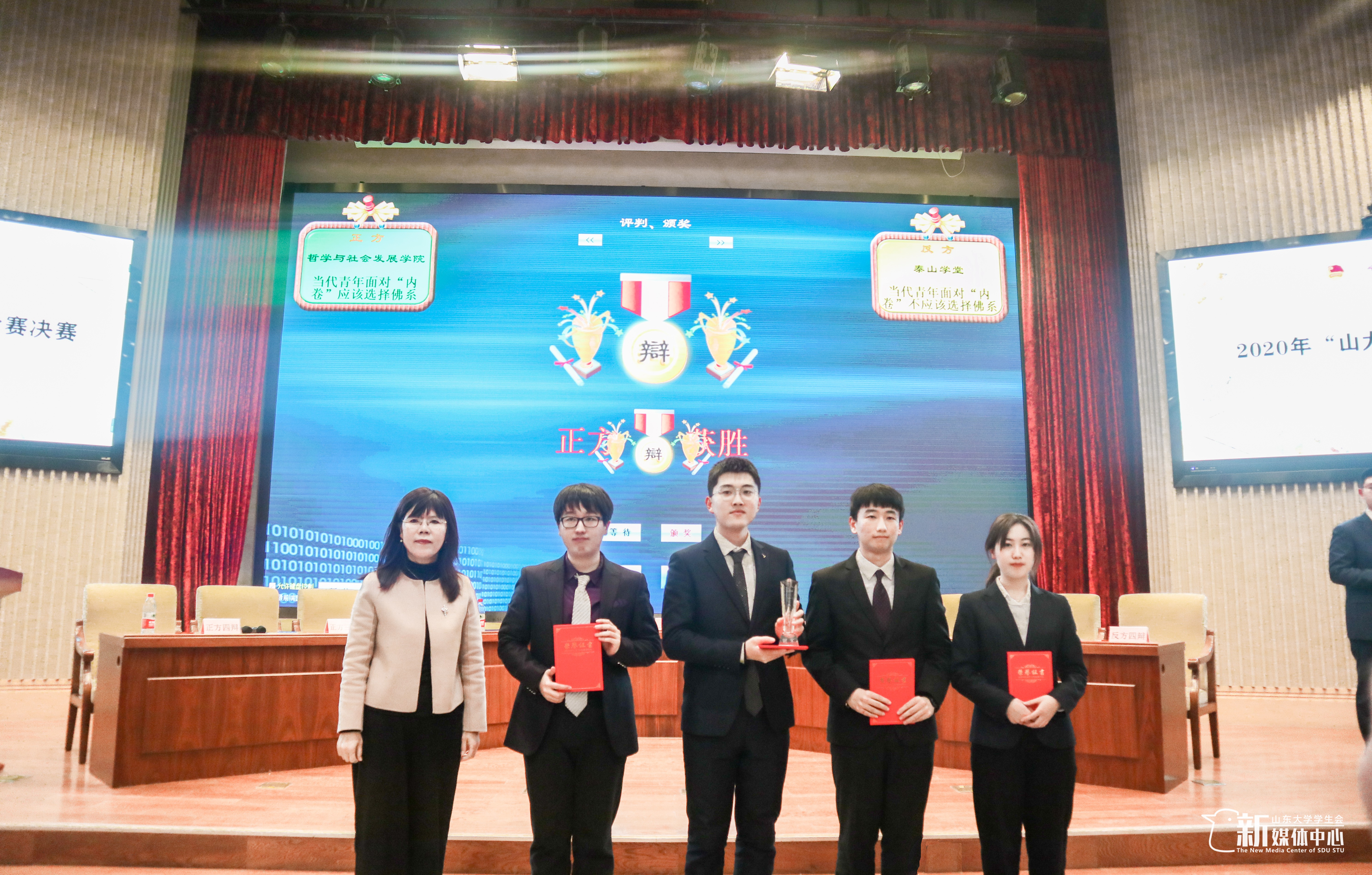 立足佛系的定义和作用,从个人、社会等层面,论述“佛系”能够帮助青年追求更精彩的人生,帮助社会解决内卷的风气,并从定义出发,引用原典,并举出许多“佛系”青年成就精彩人生的例子,对反方的质询有力回击。最终,哲社辩论队以5:2的成绩取得胜利,斩获本年度山大辩论赛冠军,三辩于耀翔获得山大杯全程最佳辩手称号。