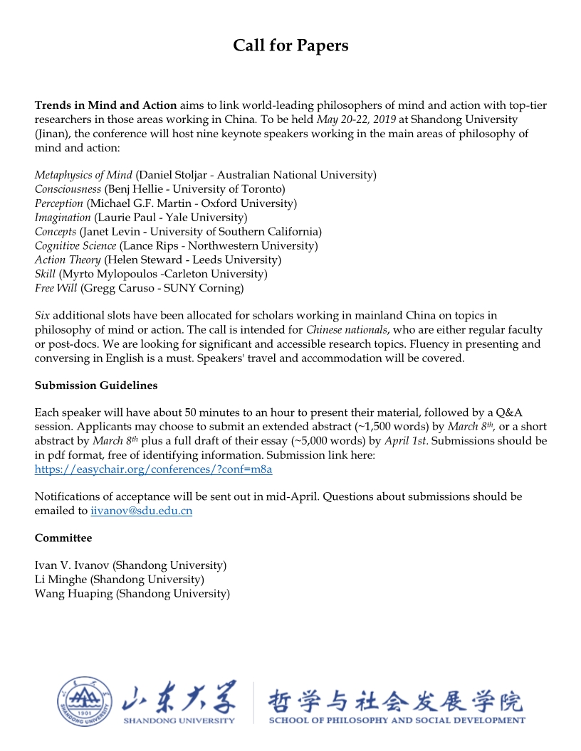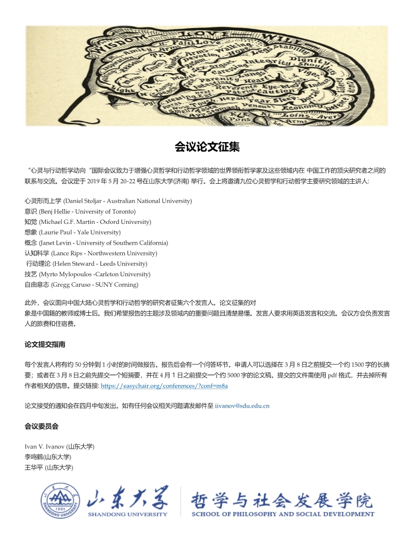 bet007足球比分(中国)官方网站 将于2019年5月20-22日举行”心灵与行动哲学动向“国际会议,在此征集六个会议报告人。此次会议旨在汇集心灵哲学与行动哲学主要领域的海外及国内一流学者的研究成果。除了国内的六个报告,会议还将有9名世界领衔学者的主题报告。诚邀大家申请参会。 会议详情://www.easychair.org/cfp/M8A 线上提交://easychair.org/conferences/?conf=m8a