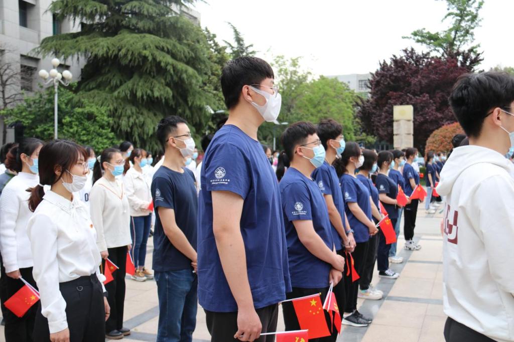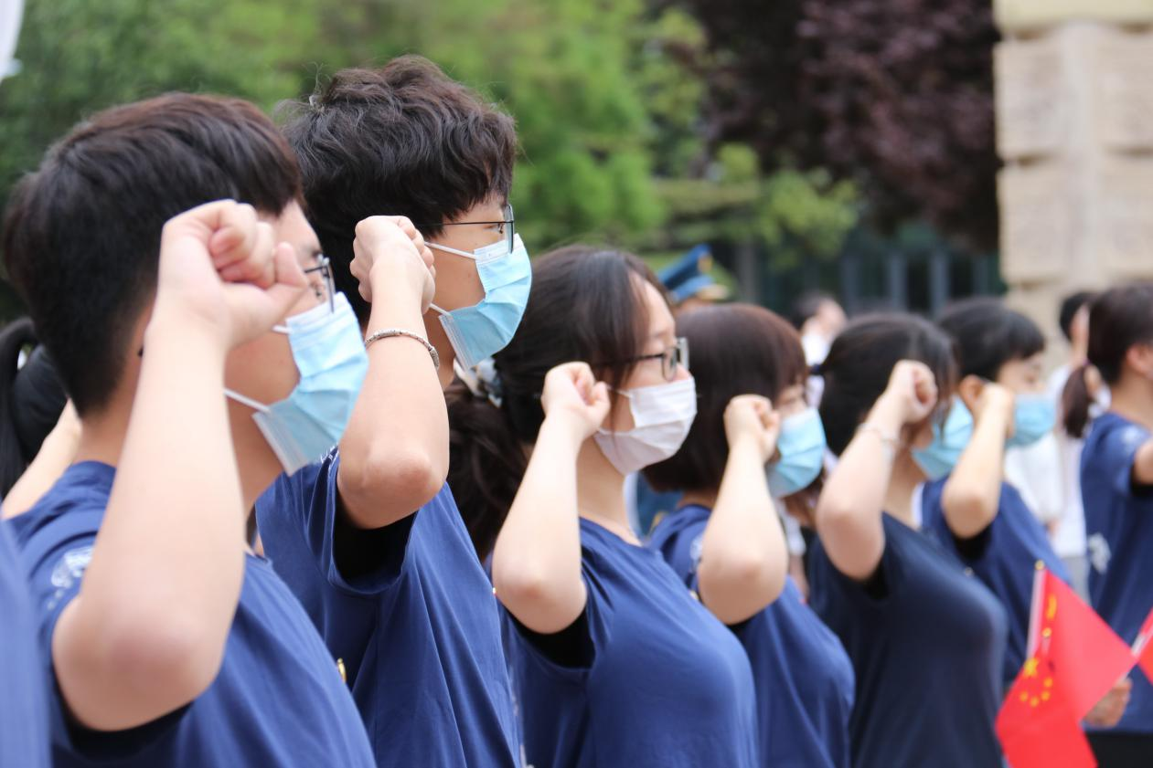 接下来在山东大学管理学院2019级硕士研究生戚真的带领下,团员们郑重地举起右拳,目光灼灼,语调铿锵,在国旗下重温入团誓词,表达了山大学子勤奋学习,不忘初心,为共产主义事业不断奋斗的坚定决心。